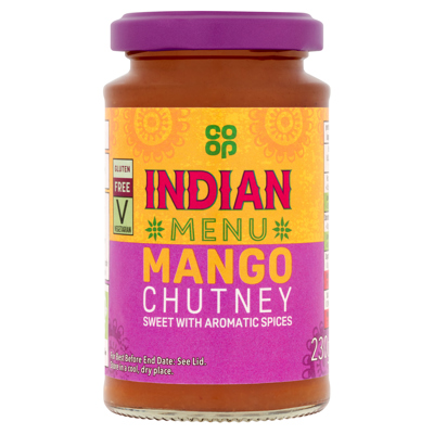 A sweet, sticky chutney with mango pieces and aromatic spices.