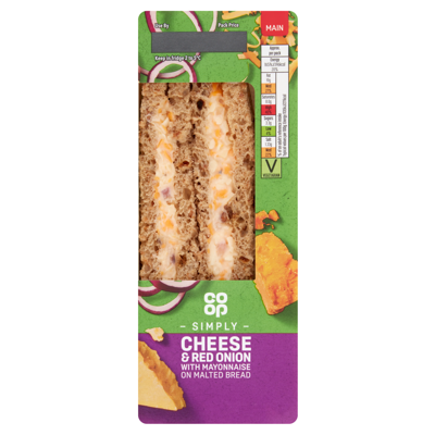Medium mature Cheddar and Red Leicester cheese with mayonnaise, red onion and mustard on malted bread.