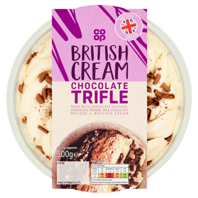 Layers of chocolate flavour custard, chocolate sponge, chocolate mousse, and a sweetened stabilised whipped cream topping, sprinkled with chocolate curls