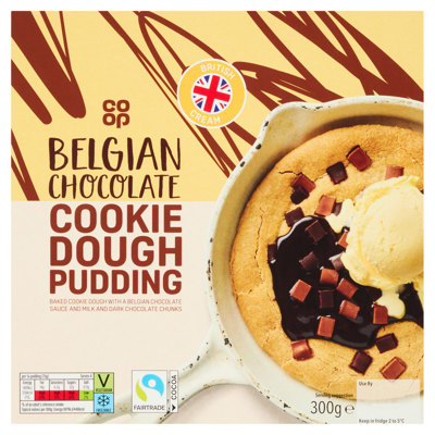 Baked cookie dough with Belgian milk and dark chocolate chunks and a Belgian chocolate sauce