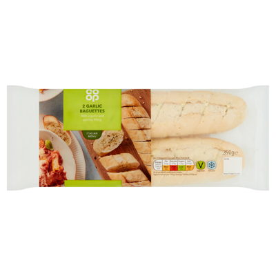 2 Part-baked baguettes filled with a garlic, parsley, butter and spread blend