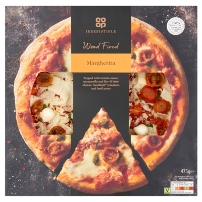 Pizza base topped with tomato sauce, mozzarella cheese, Fior di Latte, SunBlush® cherry tomatoes and basil pesto