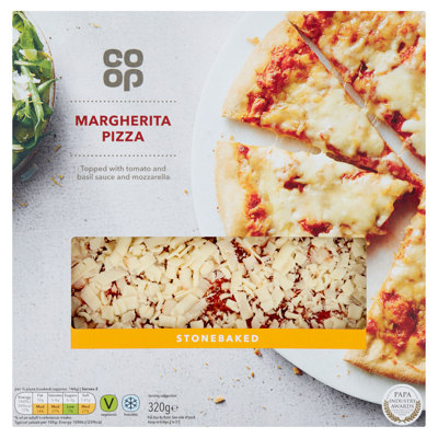 Stonebaked pizza base topped with tomato and basil passata sauce and mozzarella cheese