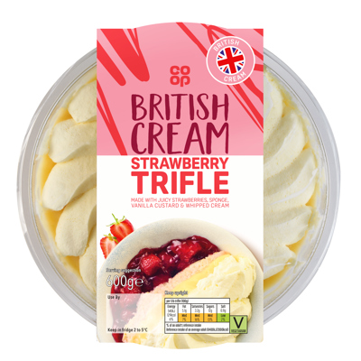 Strawberries in a strawberry flavour jelly with sponge, vanilla flavour custard and a sweetened stabilised whipped cream topping