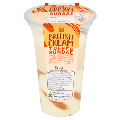 Layers of vanilla flavour, toffee flavour and cream mousses sauce and toffee flavour sauce, sponge pieces and caramel brittle pieces.