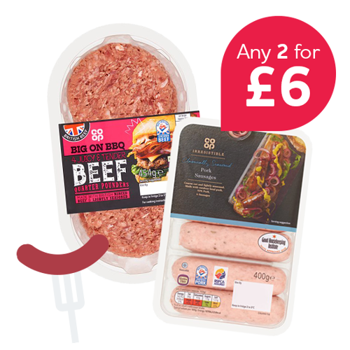 Co-op British Quarter Pounder Burgers 4 Pack / Co-op Irresistible Smoky Pulled Pork Burger With Apple / Co-op Lamb & Mint Kofta Kebab / Co-op British Sweet & Smoky BBQ Beef Kebabs.